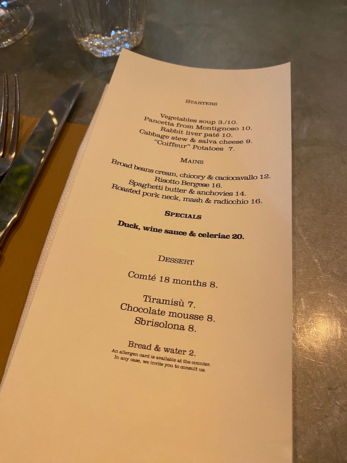 We opt for the bar, so we can watch the kitchen. A lazy eye over the menu makes clear the fundamentals are well handled. The skinny slip of paper offers five starters, four mains, one special, and a dessert list that begins: