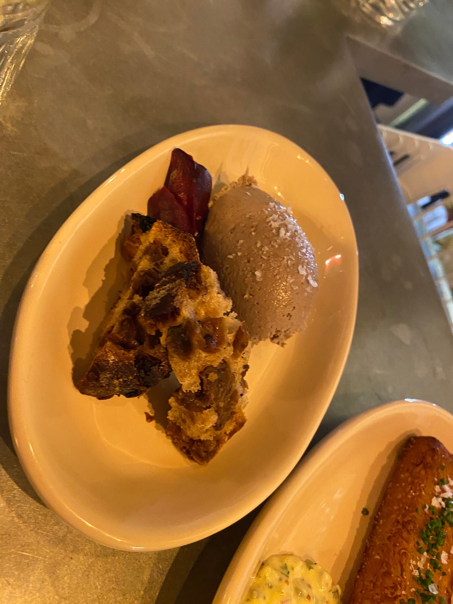 There’s an extensive natural wine list, which I forget to pay much attention. I have no clue what we end up drinking. Clearly this is the worst sort of review. We’re offered bread, and a glass of cava so green my eyeballs pucker.