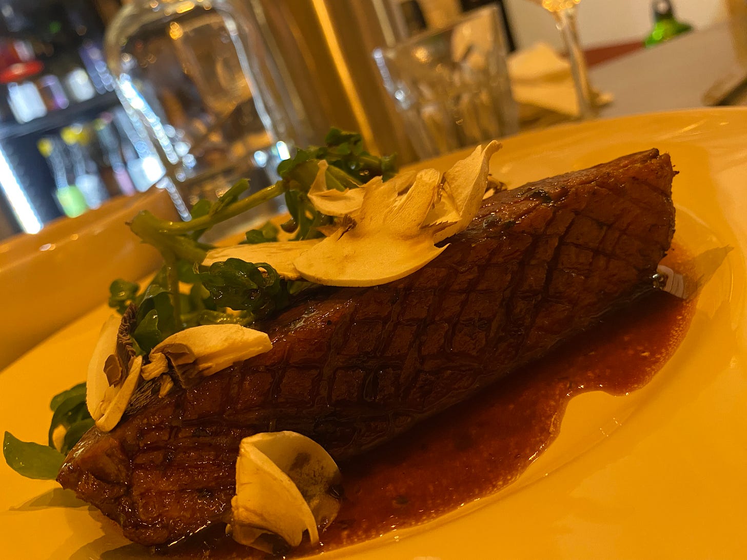 Three starters for two is more than enough, so we opt to share a main. The special seems obvious. Perfectly cooked duck, fat rendered to a satisfying crisp, sits atop a celeriac purée so smooth you’d happily drown in it. Finished with wine jus, a slap of pepper-fresh watercress and shavings of raw mushroom, the muddle of cooked, raw, hot, cold, creamy and bitter could easily not have worked, but it does.